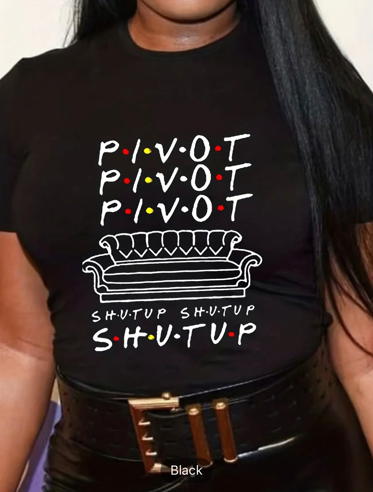 Plus Size Casual Tee, Women's Plus Sofa & Letter Print Short Sleeve Slight Stretch Tee