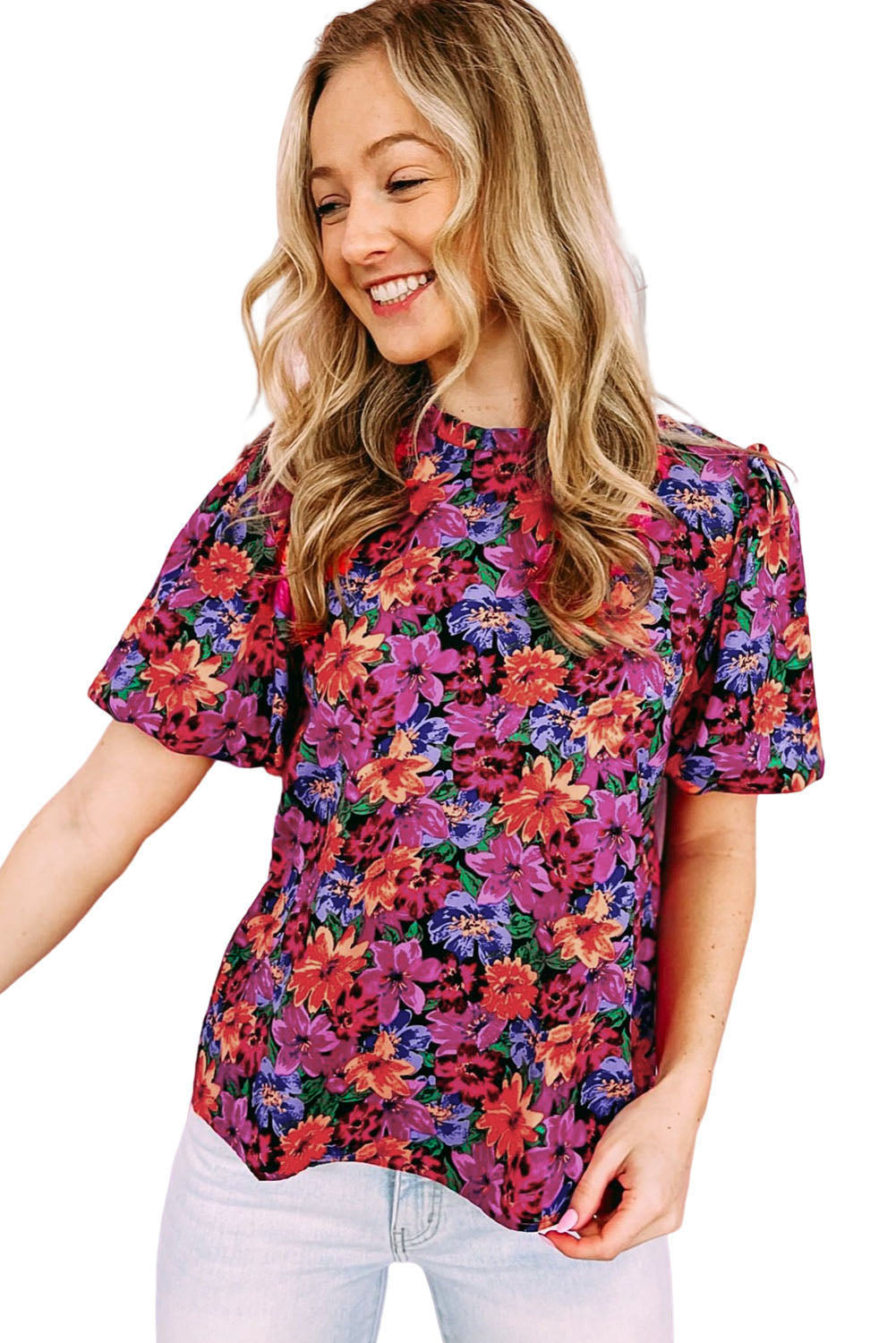 Multicolor Floral Print Round Neck Puff Sleeve Blouse