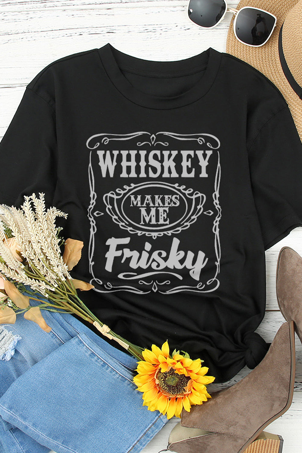 •WHISKEY Makes Me Frisky Print Crewneck Graphic Tee